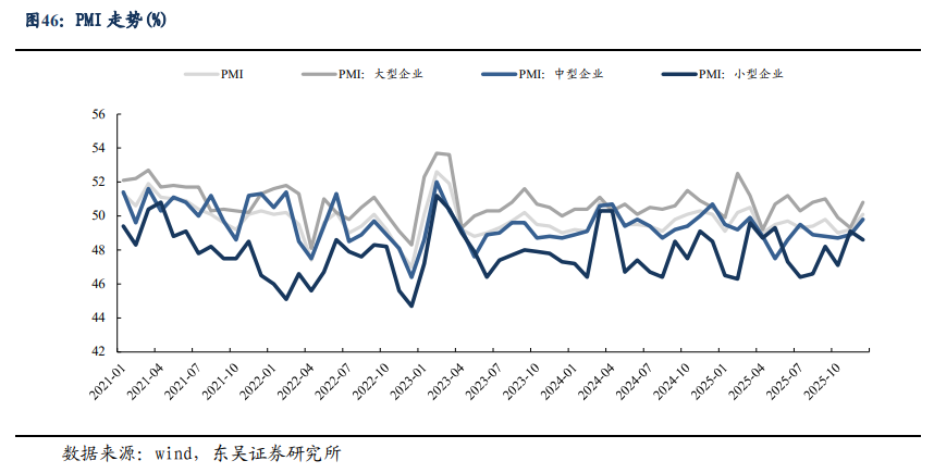 12月制造业PMI 50.1%,前值49.2%,环比 0.9pct:其中大/中/小型企业PMI分别为50.8%/49.8%/48.6%,环比 1.5pct/ 0.9pct/-0.5pct;2025年12月工业增加值累计同比 6.4%;2025年12月制造业固定资产投资完成额累计同比 0.6%。