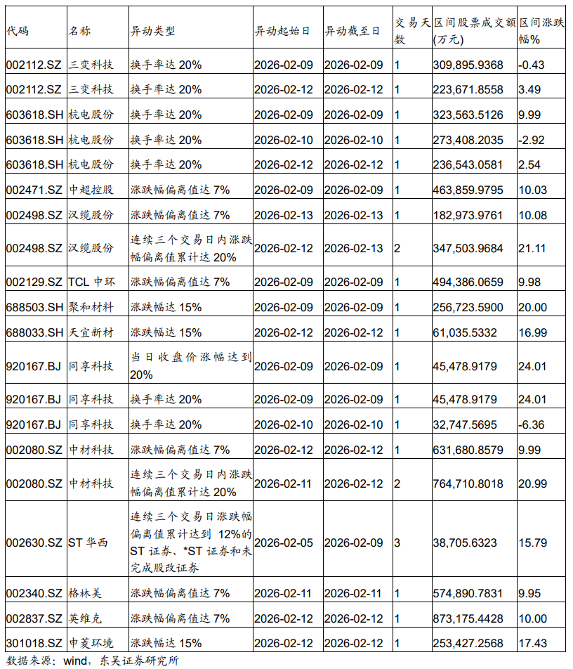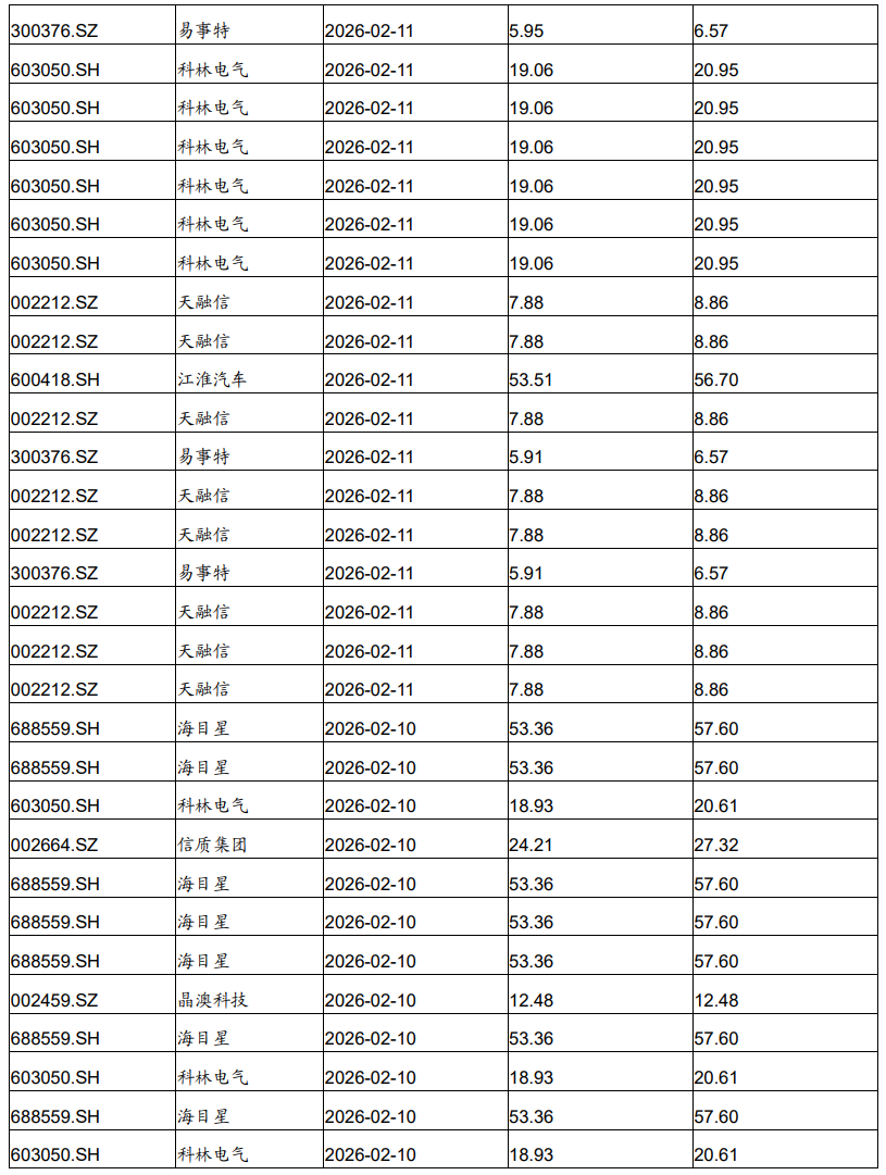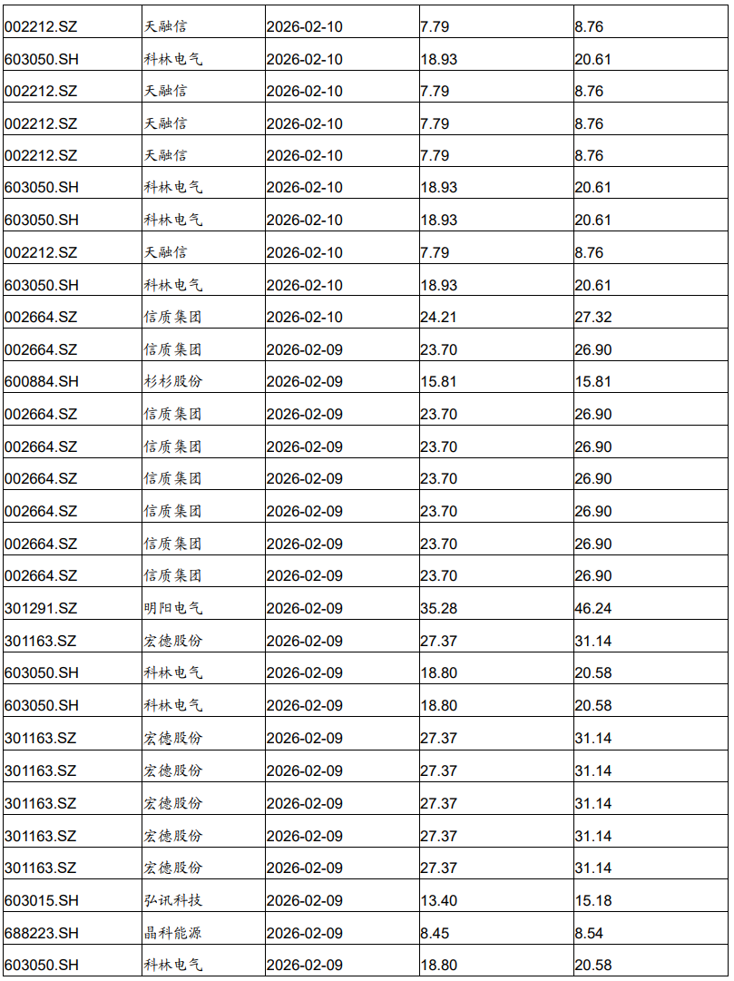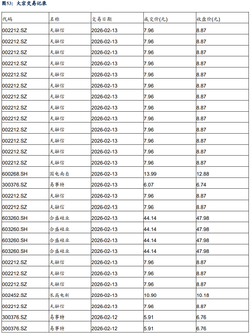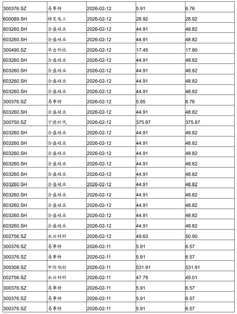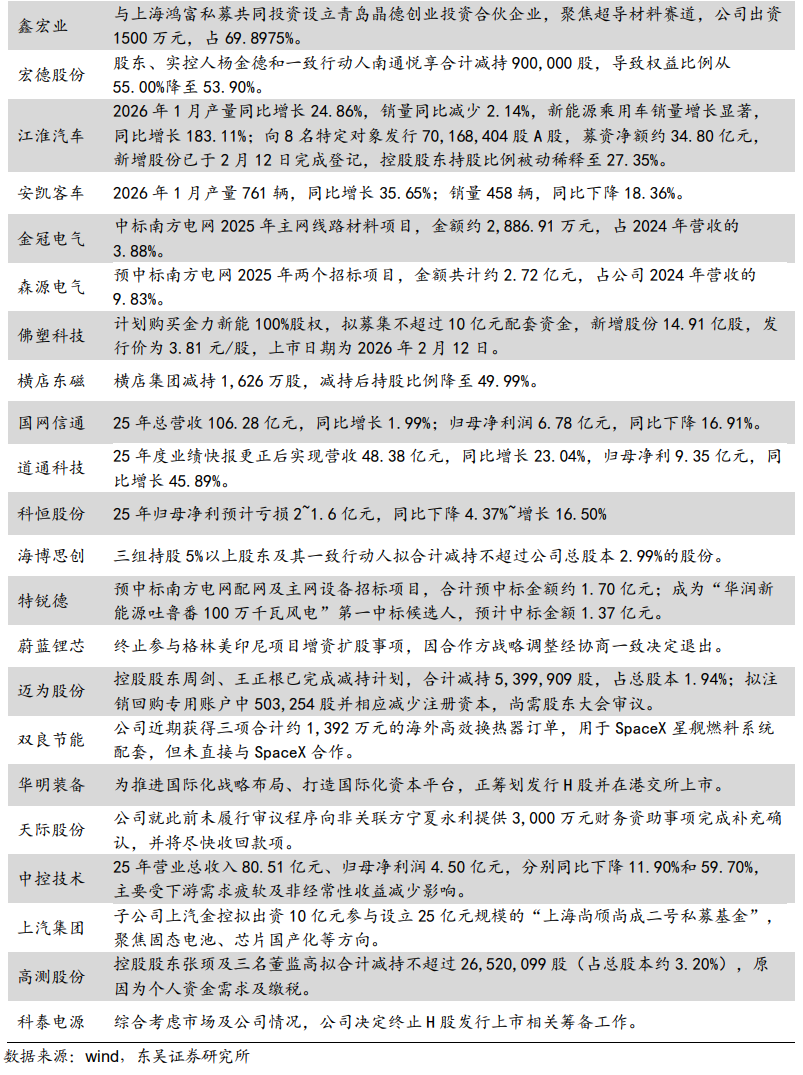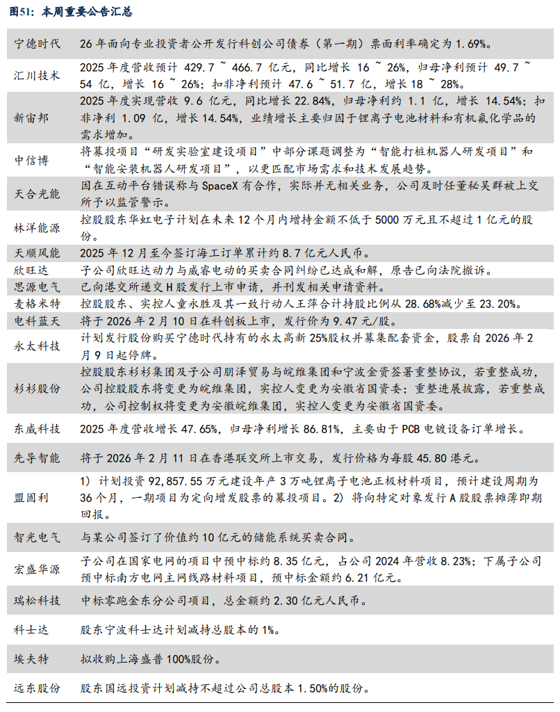 公司层面:宁德时代:26年面向专业投资者公开发行科创公司债券(第一期)票面利率确定为1.69%。汇川技术:2025年度营收预计429.7~466.7亿元,同比增长16 ~ 26%,归母净利预计49.7 ~ 54亿元,增长16~26%;扣非净利预计47.6 ~ 51.7亿元,增长18 ~ 28%。新宙邦:2025年度实现营收96亿元,同比增长22.84%,归母净利约11亿元,增长14.54%;扣非净利10.9亿元,增长14.54%,业绩增长主要归因于锂离子电池材料和有机氟化学品的需求增加。天合光能:因在互动平台错误称与SpaceX有合作,实际并无相关业务,公司及时任董秘吴群被上交所予以监管警示。林洋能源:控股股东华虹电子计划在未来12个月内增持金额不低于5000万元且不超过1亿元的股份。天顺风能:2025年12月至今签订海工订单累计约8.7亿元人民币。欣旺达:子公司欣旺达动力与威睿电动的买卖合同纠纷已达成和解,原告已向法院撤诉。思源电气:已向港交所递交H股发行上市申请,并刊发相关申请资料。麦格米特:控股股东、实控人童永胜及其一致行动人王萍合计持股比例从28.68%减少至23.20%。海博思创:三组股东拟在2026年3月13日至6月12日期间,通过集中竞价或大宗交易方式合计减持不超过5,402,774股,占总股本3.00%。电科蓝天:中电科蓝天科技股份有限公司(股票代码:688818)于2026年2月10日上市。