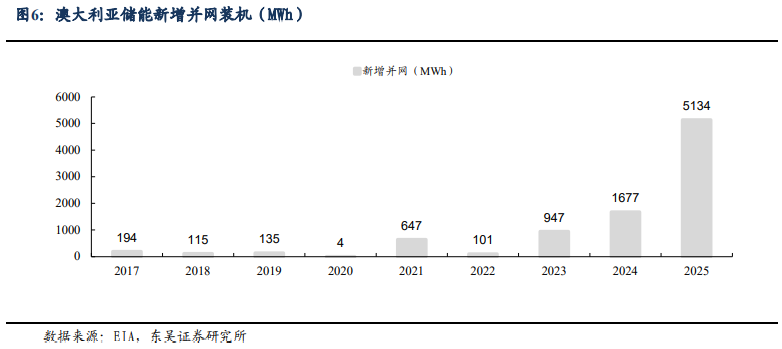 澳大利亚: 25年并网延续高增态势、在建和储备项目规模大。25Q3澳大利亚大储新增并网3个储能项目,合计0.54GW/1.8GWh;25Q4新增并网2.3GWh,创历史新高。25年累计并网5.1GWh,配储时长2.8h,较24年提升0.1h。截至25Q3有74个储能项目正在推进中,容量/能源输出相当于13.3GW/35GWh。