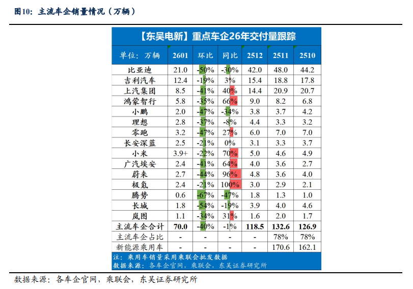 n国内电动车1月销量平淡,符合预期,国补已陆续到位,预计3月将明显恢复。中汽协:1月国内电动车销量94.5万辆,同环比0%/-45%,符合预期;乘联会:1月电动国内乘用车零售60万辆,同环比-20%/-55%,相对平淡,受部分省市补贴未到位影响,预计3-4月增速恢复。分车企,比亚迪销21.0万辆,同环比-30%/-50%,海外销售10.0万辆;吉利汽车销12.4万辆,同环比 3%/-19%;鸿蒙智行销5.8万辆,同环比 66%/-35%。新势力中,小鹏销2.0万辆,同环比-34%/-47%;零跑销3.2万辆,同环比 27%/-47%;蔚来销2.7万辆,同环比 96%/-44%;极氪销2.4万辆,同环比 100%/-21%;岚图销1.1万辆,同环比 31%/-34%;小米销3.9万辆 。预计26年国内本土电动车销量增长5%,出口增长50%,合计批发销量增长13%。商用车方面,1月电动重卡销量2.1万辆,同环比 191%/-40%,电动化率20%,表现依然强劲,26年电动重卡有望实现30-50%增长。