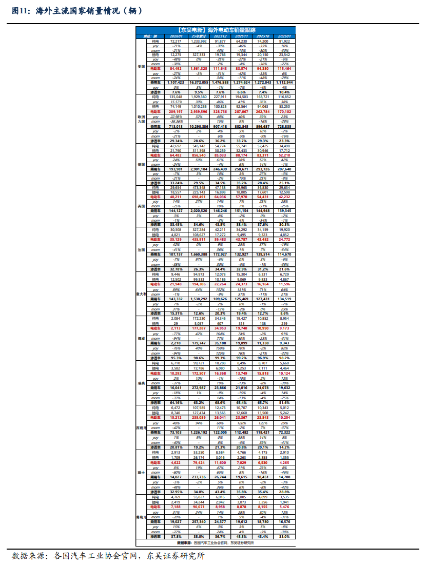 n1月欧洲电动车销量同比稳步提升,全年预期30%增长。1月欧洲9国合计销量20.9万辆,同环比 23%/-36%,电动车渗透率29.3%,同环比 6.0/-6.9pct。其中德国1月电动车销量6.4万辆,同环比 24%/-24%,渗透率33.2%,同环比 8.1/-1.3pct;英国1月电动车销量4.8万辆,同环比 14%/-25%,渗透率33.5%,同环比 3.1/-10.3pct;法国1月电动车销量3.5万辆,同环比 42%/-41%,渗透率32.8%,同环比 11.2/-1.6pct;意大利1月电动车销量2.2万辆,同环比 89%/-1%,渗透率15.3%,同环比 6.7/-5.0pct;挪威1月电动车销量0.2万辆,同环比-77%/-94%,渗透率95.3%,同环比-2.9/-4.1pct;瑞典1月电动车销量1.0万辆,同环比 2%/-37%,渗透率64.2%,同环比 12.6/-4.4pct;西班牙1月电动车销量1.5万辆,同环比 48%/-42%,渗透率20.8%,同环比 6.6/-0.5pct;瑞士1月电动车销量0.5万辆,同环比 8%/-60%,渗透率33.0%,同环比 4.1/-10.4pct;葡萄牙1月电动车销量0.7万辆,同环比 31%/-20%,渗透率37.8%,同环比 4.7/ 1.0pct。