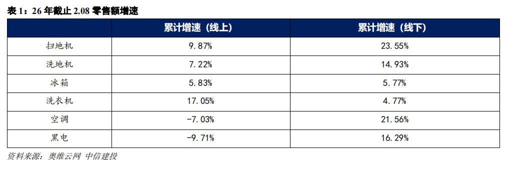 尽管市场担心国内需求的压力,但是2026年的国补仍有拉动,且考虑到品类进一步集中,预计对于大家电的销量的覆盖并不会比25年少。根据奥维云网的数据,截止到2月8日的销售数据,目前整体仍有增长,不过考虑春节错期效应具体数据还得1-2月看合计数据。