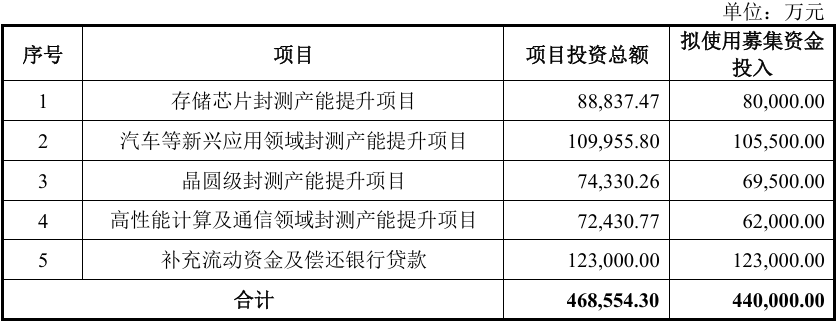 汽车等新兴应用领域封测产能提升项目:计划投资109,955.80万元提升汽车等新兴应用领域封测产能,项目建成后年新增汽车等新兴应用领域封测产能50,400万块。本项目实施将有助于公司进一步调整产品结构、扩大生产规模、增强抗风险能力,巩固并增强公司在车载等封测领域的优势地位。