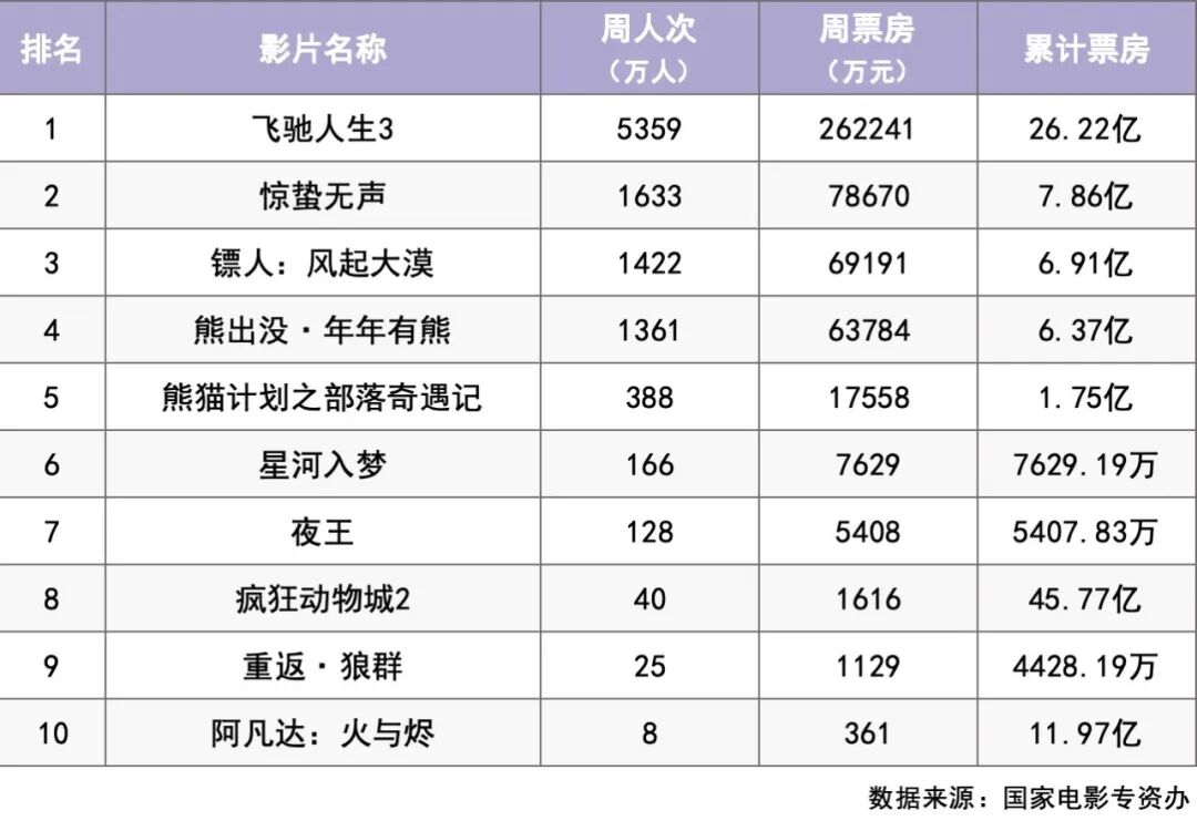 《飞驰人生3》开画首日单日票房6.41亿元,上周共收获26.22亿元,远超同档期其他影片。尽管在《飞驰人生2》中,主人公张驰的逆袭已经非常圆满,但这一部在叙事上又实现了新突破,融入人机博弈与“被资本做局”等当下热门议题,加上导演对群像戏的精准把握,收获一众好评,在春节档“一骑绝尘”。