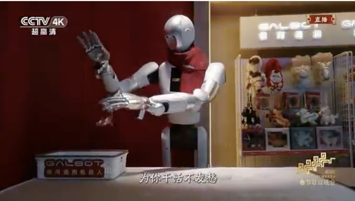 在春晚微电影《我最难忘的今宵》中,银河通用的盖博特机器人进行了盘核桃、叠衣服等精细操作。依托类脑具身大模型,银河通用机器人也能通过视觉和触觉感知环境,完成消费场景和工业场景内的复杂任务。甚至有消息称,除了舞台上表演,盖博特机器人还得在春晚后台打工,负责搬运设备、递送道具,甚至能根据导演手势调整灯光角度。