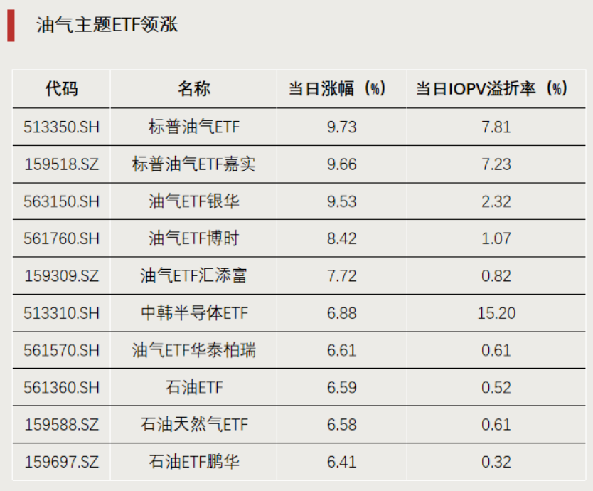 2月24日,油气、有色金属、通信等板块涨幅居前。ETF方面,油气主题ETF领涨,标普油气ETF(513350)、标普油气ETF嘉实(159518)、油气ETF银华(563150)均涨逾9%,油气ETF博时(561760)、油气ETF汇添富(159309)分别上涨8.42%和7.72%。