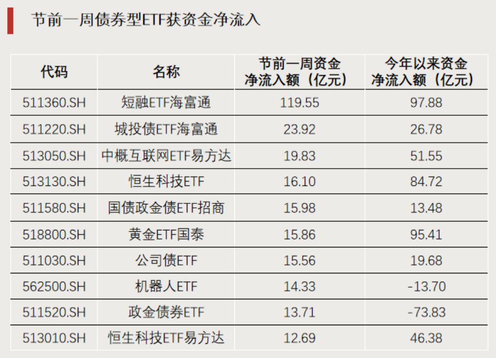 春节前一周(2月9日—2月13日),多只债券型ETF获资金净流入,股票宽基ETF则维持净流出态势。
