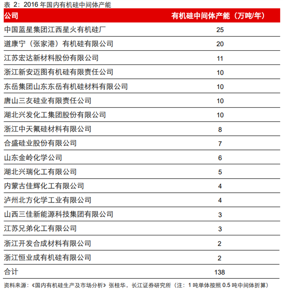 技术成熟后,国内有机硅行业进入扩张期。在国内有机硅大量缺口和大量进口的背景下,我国有机硅新建项目进入快速扩张期,世界产能也向中国集中。由于此前国内有机硅企业较少,生产规模较小,多个新建项目的集中建成投产导致国内有机硅产能在2009-2010年出现爆发式增长,有机硅中间体年产能分别为44万吨和78万吨,同比增速分别高达84%和78%。其后几年行业产能增速出现放缓,但仍处于持续扩产能状态,2008年-2016年有机硅产能复合增速高达24%。在此期间,江西星火、江苏宏达、浙江新安、山东东岳、唐山三友、湖北兴发、浙江中天、山西三佳等企业快速实现规模化生产,2016年我国有机硅中间体产能达到近140万吨/年,其中龙头企业仍然以中外合资企业为主,包含江西星火的25万吨年产能和道康宁的20万吨年产能等。