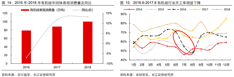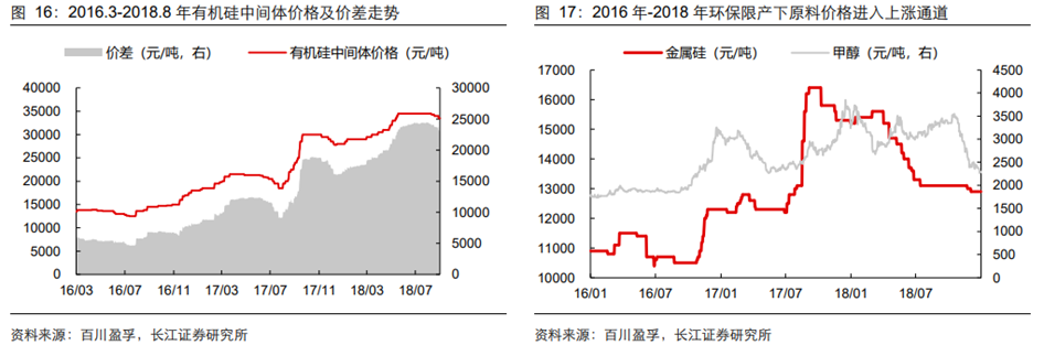 需求稳步增长,环保限产点燃有机硅涨价行情。需求端,2016-2018年有机硅表观消费量稳步增长,两年复合增速为13%。供给端,2016年8月开始,中国环保部(现生态环境部)开始进行环保督察,对有机硅行业的开工率造成很大影响,2016年6月-8月行业开工率从71%下降到48%,不断有环保不达标的企业停产检修。同时原材料工业硅和甲醇也受环保督察影响降低负荷,价格自2017年开始暴涨,供应端负荷又难以提上去,因此有机硅价格及价差期间一路上行,从2016年初的1.4万元/吨上涨至2018年8月的3.4万元/吨,期间涨幅高达148%。