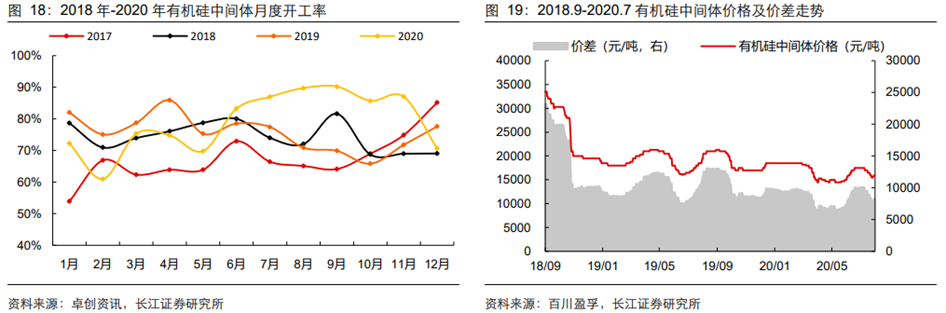 2006-2018年有机硅供给过剩,期间有机硅景气下行。在宏观经济形势低迷的大背景下,有机硅行业受产能过剩和国外巨头强力冲击影响,国内市场需求不旺、生产成本不断上升,有机硅中间体价格近几年连续下滑,价差持续收窄。