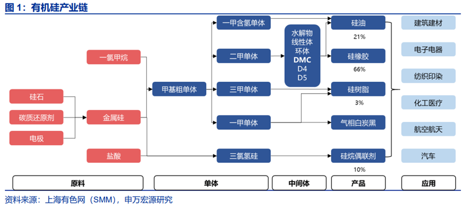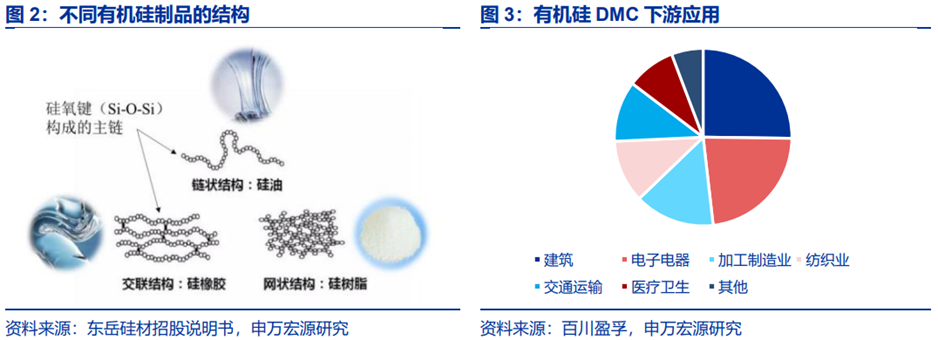 有机硅下游消费场景广泛,硅橡胶为最大终端产品。有机硅产业链由原材料、单体及中间体、下游深加工产品及终端应用等环节组成,其特点是下游产品开发为中心带动上游单体合成,呈现集中的单体和中间体生产、分散的产品深加工的模式。有机硅下游终端产品主要包括硅橡胶(占比约67%)、硅油(占比约30%%)、硅树脂(占比不到4%)等三大类。由于有机硅独特的结构,兼备无机材料与有机材料的生理惰性、表面张力低、耐高低温、电气绝缘、耐候性等性能,使之具备“工业味精”的美誉,被广泛应用于建筑装饰、电子电器、电力新能源、纺织制造、医疗护理、汽车交通、工业助剂、功能性助剂等领域。