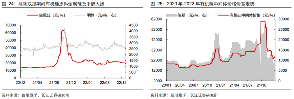 2021.2-2021.11:需求驱动主导。需求端,2021年下半年开始,海外逐步放开管控,企业逐步复产,海外进入补库周期,2021年我国有机硅中间体出口量高达45万吨,同比大幅增长55%。成本端,2021年8月发改委发布关于《2021年上半年各地区能耗双控目标完成情况晴雨表》的通知,青海、云南、新疆等地能耗强度降低、总量控制目标均达一级预警,部分地方政府对高耗能行业进行限产停工、拉闸限电。彼时有机硅主要原料甲醇和工业硅双双大涨,两个月内涨幅分别高达38%和284%,进一步推动有机硅价格抬升,两个月内其从8月的3.0万元/吨实现翻倍增长。