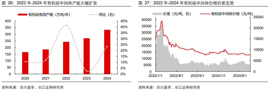 经历2021年行业高位运行后,行业丰厚利润吸引大量企业投资建设,2022年-2024年有机硅中间体有效产能大幅扩张,从2021年的187万吨/年增长至2024年344万吨/年,供给逐渐过剩,产品价格从高位的3.9万元/吨回落至1.3万元/吨左右,价差从高点的1.7万元/吨收窄至2024年底的0.4万元/吨左右,毛利率长期承压下厂商利润修复意愿较强。