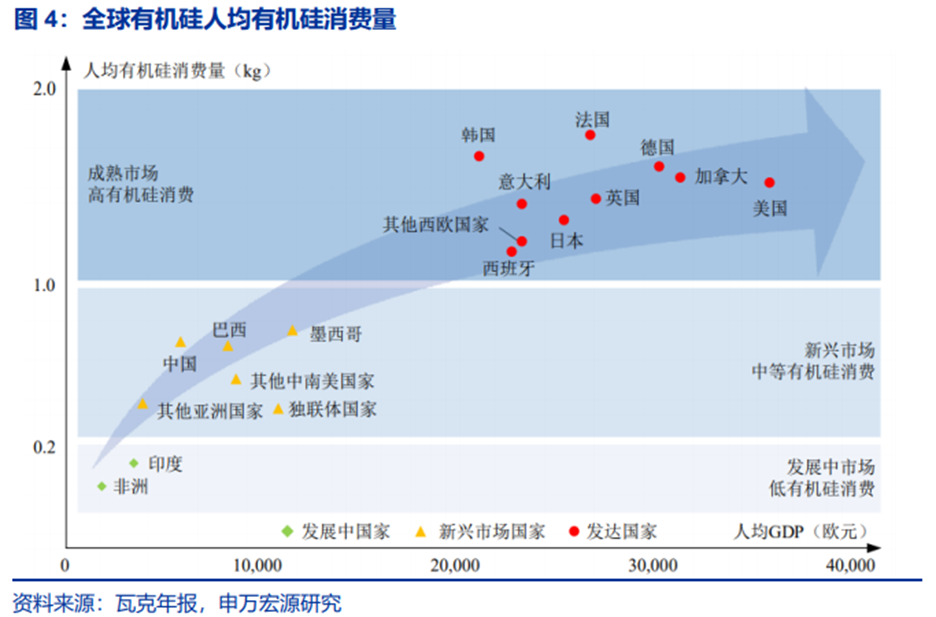 有机硅消费量仍具备较大增长潜力。根据瓦克年报统计,人均有机硅消费量与人均GDP水平基本呈正比关系。相较发达国家和地区的人均有机硅需求2kg,中国等新兴市场国家人均有机硅消费量还不到1kg,印度等发展中国家只有0.2kg不到,新兴国家、发展中国家的提升潜力仍较大。伴随经济发展,新兴国家、发展中国家的消费升级将是必然,有机硅消费量将随之增长。