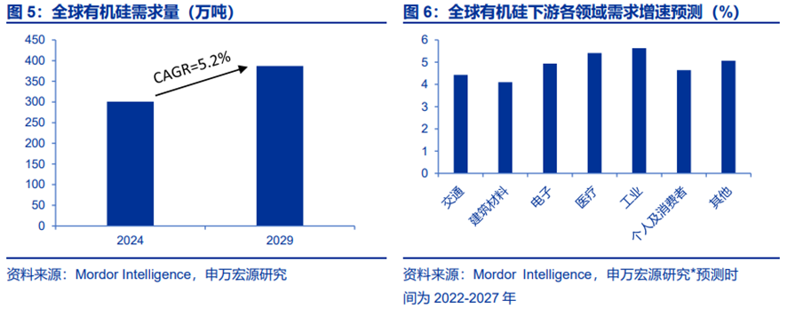 据Mordor Intelligence报告,2024年有机硅市场规模为301万吨,预计到2029年将达到387万吨,2024-2029年复合年增长率为5.2%。从下游结构而言,工业、医疗、电子等领域需求增速较快。