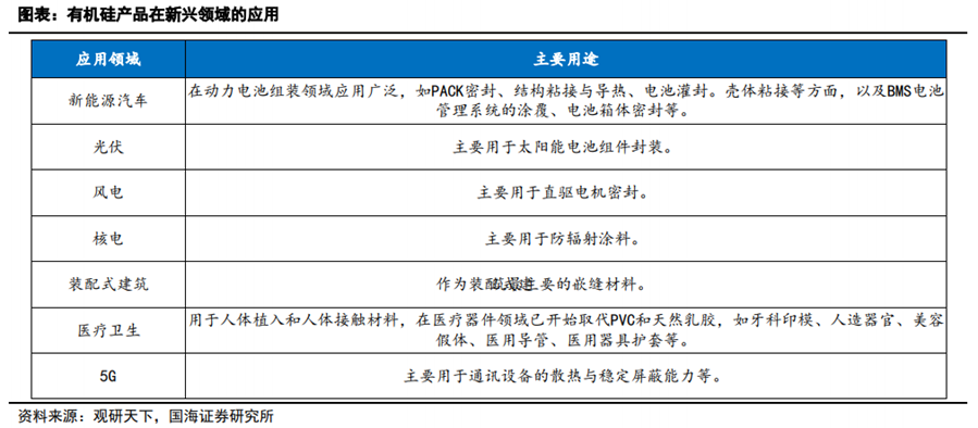 有机硅应用向新能源汽车、光伏、风电、核电、装配式建筑、医疗、3D打印、5G等新兴领域渗透,未来需求有望进一步增长。