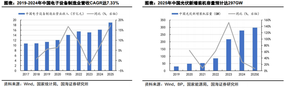 据工信部、商务部数据,2024年我国规模以上电子信息制造业增加值同比增长11.8%。随着数字经济蓬勃发展,消费品“以旧换新”、低空经济等国家“一揽子”增量政策的持续推动将催生行业旺盛需求。