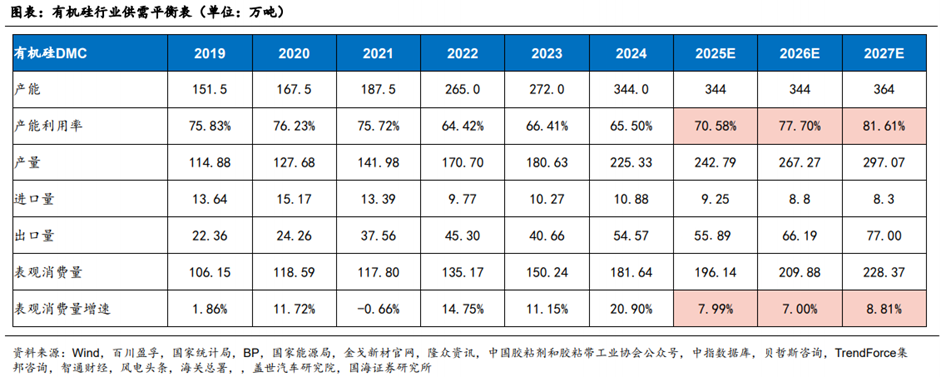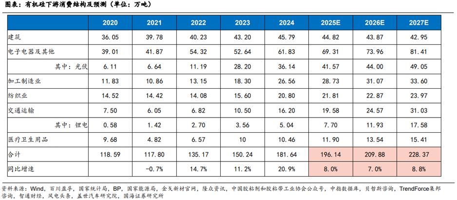 下文将展望新的周期。自2021年上一轮景气周期以来,有机硅的扩产周期逐渐进入尾声,2025-2026年行业暂无新增产能,2026-2027年行业整体新增产能有限,因此有机硅需求的增长成为该产品的研究重点: