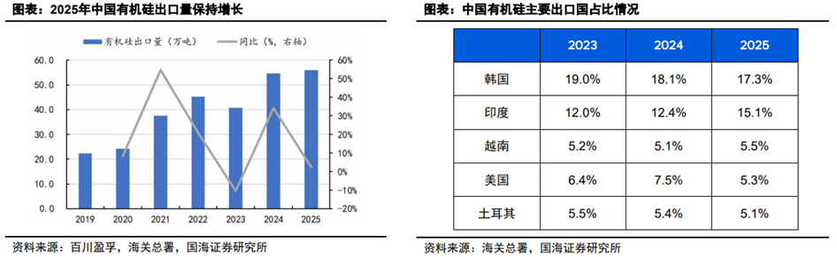 有机硅出口量自2023年以来重回增长。据海关总署数据,2024年中国有机硅出口量为54.6万吨,同比增长34.3%;2025年,中国有机硅出口量总计55.9万吨,同比增长2.4%。