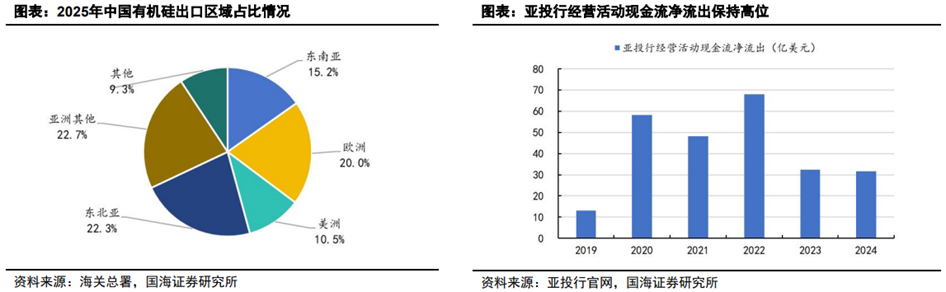 亚洲基础设施建设将拉动大量对有机硅用胶的需求。据中国财经报,根据亚洲开发银行预测,未来10年,亚洲基础设施投资需要8.22万亿美元,即每年需要新增投入8200亿美元基础设施资金。2025年,东南亚和亚洲其他地区的出口量同比增速较高,分别达到13.1%和15.8%,为出口增长贡献高需求增速。