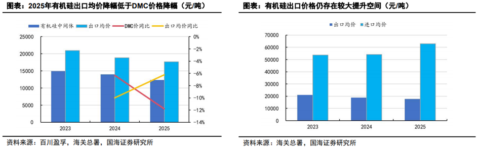 一方面,据百川盈孚和海关总署数据,2025年,有机硅出口均价降幅为6.2%,低于有机硅中间体降幅11.8%,说明有机硅出口已逐步向附加值高的产品转型,受原料价格波动影响相对较小。另一方面,退税取消将令出口成本激增,短期“抢出口”效应叠加减排政策,预计2026年一季度价格将震荡上行。