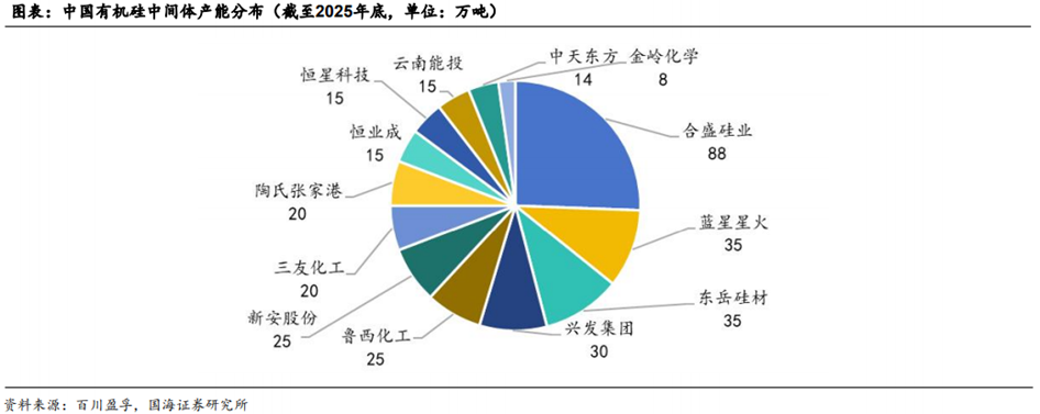 行业集中度不断提升,国内一超多强格局确立。国内有机硅中间体产能分布在13家企业,包括合盛硅业、蓝星星火、新安股份、东岳硅材、鲁西化工等,在资金、能源优势及一体化布局的影响下,行业产能正不断向龙头企业集中。据百川盈孚,截至2025年底,产能共计344万吨,CR8达81%。
