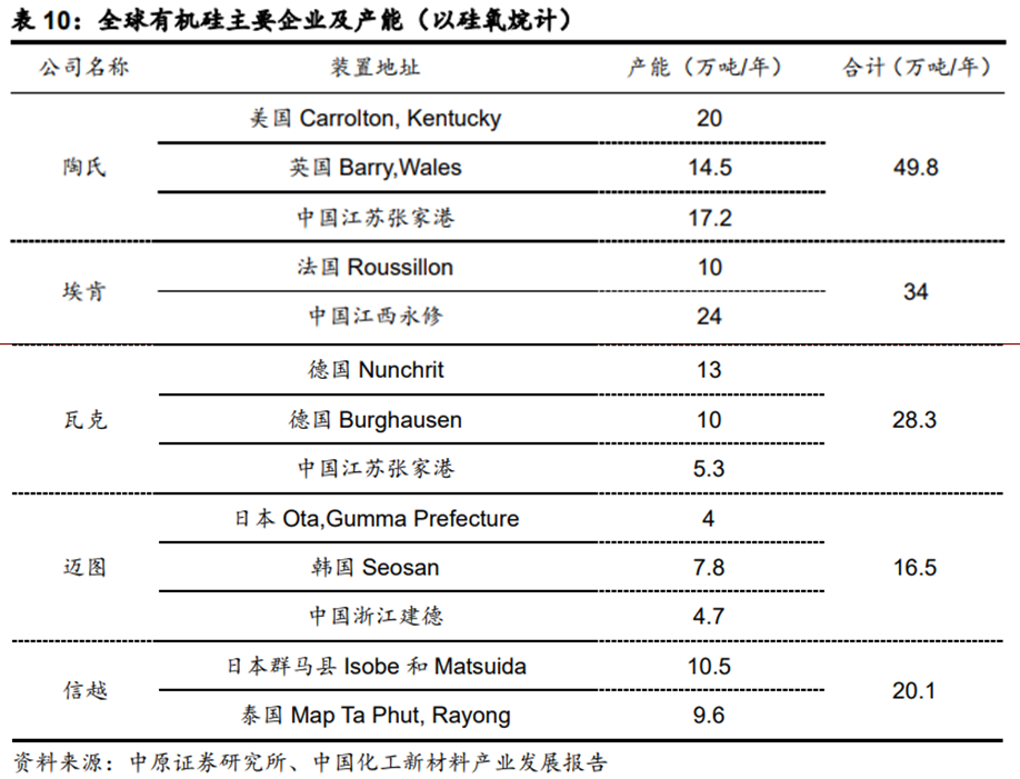 彼时我国生产技术不成熟,全球有机硅产能主要集中在海外。由于有机硅单体生产以及后加工均为技术密集型,因此长期以来有机硅为相对垄断性行业。主要生产企业有美国道康宁公司、美国迈图公司、德国瓦克公司、中国蓝星集团(中法合资)和日本信越公司,该五大公司产能合计占全球总产能的77%。