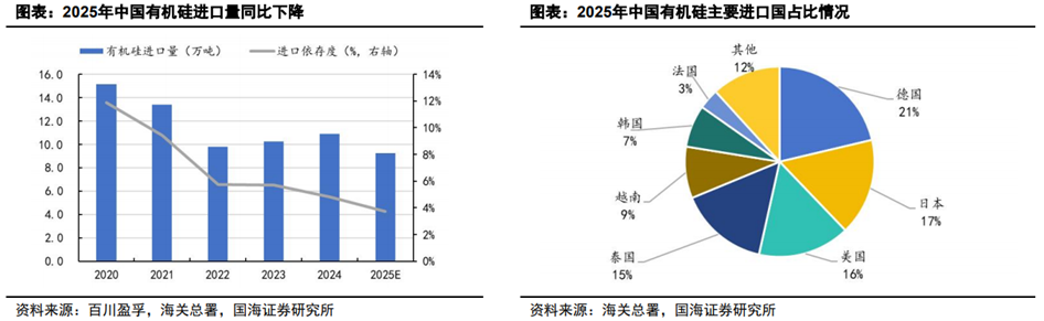 有机硅进口依存度有望保持下降。据海关总署数据,2025年中国有机硅主要进口国包括德国、日本、美国、泰国等,这些国家均有海外企业的有机硅产能。预计2025年中国有机硅进口依存度为3.7%,同比减少1.1个pct。
