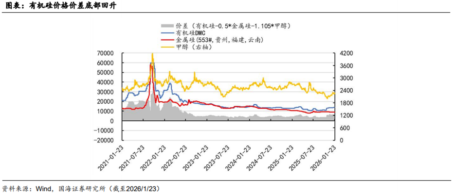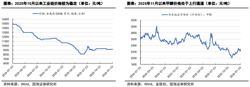 成本端,工业硅和甲醇的价格对有机硅价格维持存在支撑。据Wind,工业硅价格自2025年10月以来较为稳定,同时自2025年11月以来甲醇价格处于上行通道,预计后续成本端支撑仍将持续。