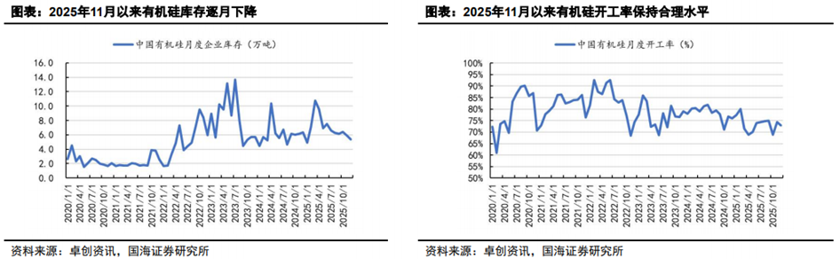 在“反内卷”会议达成的共识下,有机硅行业库存也逐步下降,开工率也保持在相对合理的水平。据卓创资讯,2025年11月以来,有机硅企业库存呈现逐月下降趋势,同时行业整体开工率保持在70%-75%的相对合理水平。
