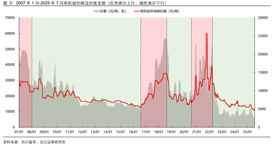 有机硅景气走势是周期品的典型演绎,近年来经历数轮周期。回顾2007年以来有机硅产品价格及价差变化,国内有机硅经历3轮周期。其中上行期分别为2008年以前,2016.7-2018.8和2020.8-2021.12;下行期分别为2008-2016年、2018.9-2020.7和2022年至2025。