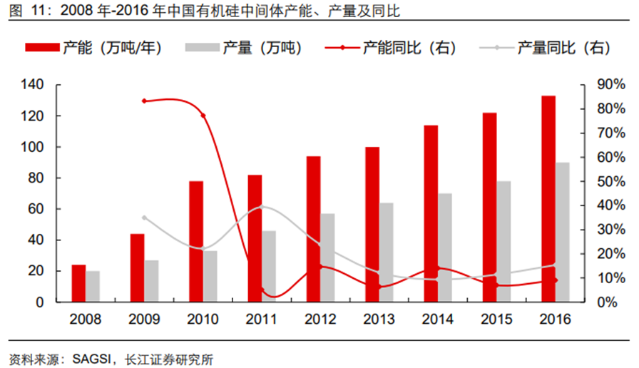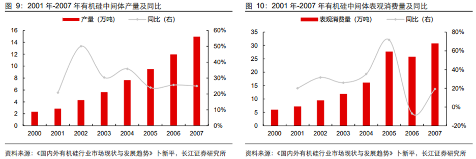 2000年-2007年,根据《国内外有机硅行业市场现状与发展趋势》,受地产需求拉动,国内有机硅中间体产量和表观消费量分别从2.4万吨和6.0万吨增长到15.0和30.8万吨。