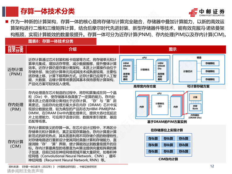 核心理念是打破存储与计算分离的传统局限,将计算能力叠加到存储器上,利用后摩尔时代的先进封装和新型存储器件等技术,实现计算能效的数量级提升。