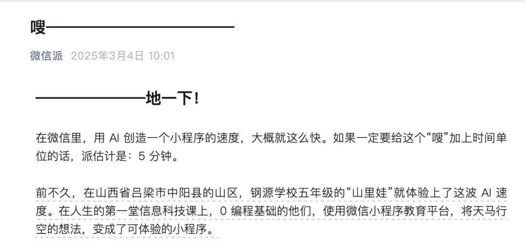 而且,“解决一个小问题”的难度已经被AI大大降低。一位开发者告诉36氪,利用AI从无到有制造一个小程序的时间成本已经被降到了数小时甚至数分钟。2025年,微信团队在官方公众号上分享了不少案例,包括“0 编程基础的五年级学生5分钟用AI创造一个小程序”等等。