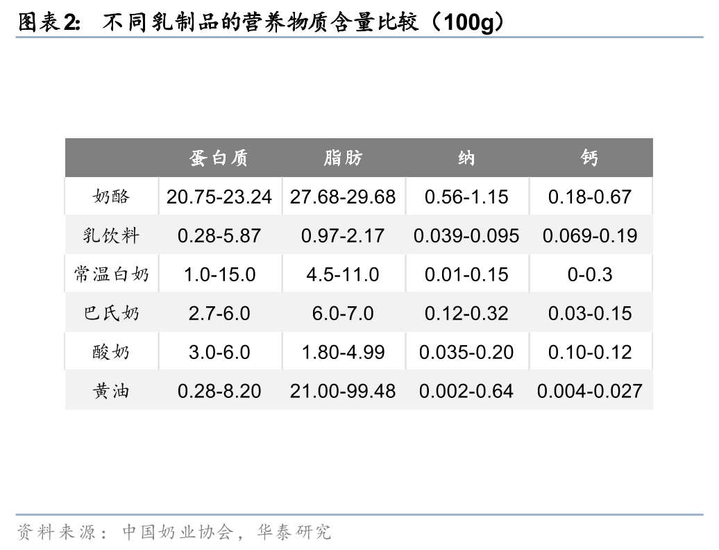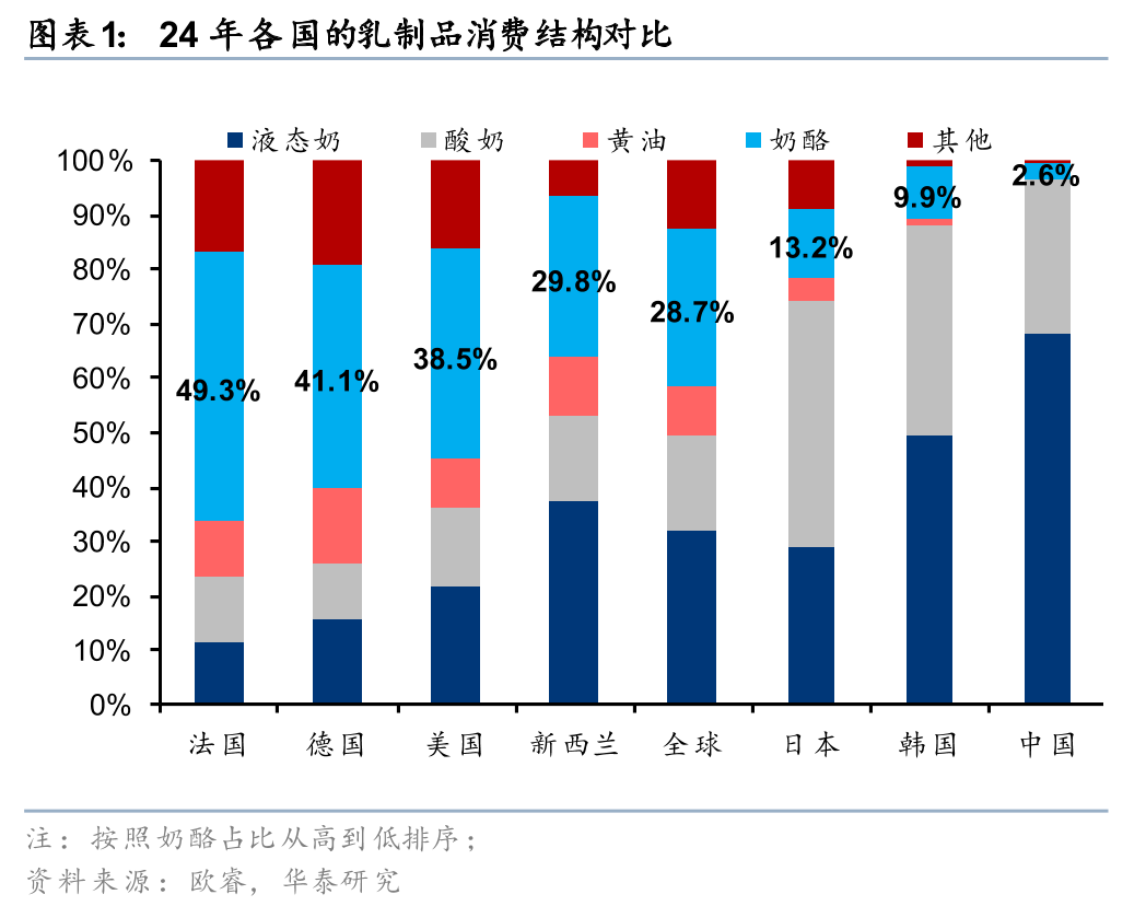 奶酪/黄油等固态乳制品或为消费升级的核心受益品类,其高浓缩特性(1kg奶酪需10kg原奶转化)与高乳脂含量显著拉升用奶需求,有望通过品类渗透推动人均乳制品消费量阶梯式增长,贡献显著的结构性增长机会。海外经验表明,从液态奶向干乳制品过渡是成熟国家乳制品消费的共同路径。横向对比海外各国,据欧睿,法国/德国/美国的乳制品消费以奶酪&黄油等固态乳制品为主,24年分别占比59.6%/55.0%/47.7%(零售额占比,下同),全球范围内奶酪&黄油的消费占比达到37.8%,而在奶酪属于舶来品的亚洲地区,日本/韩国的奶酪&黄油消费份额分别为17.1%/11.0%。我国尚处于以液奶为主的发展阶段,24年奶酪/黄油在我国乳制品消费结构中占比仅2.6%/0.5%,但伴随着奶酪品类推陈出新,C端奶酪棒产品周期企稳,奶酪企业积极推新、迭代产品形态,B端接棒板块景气成长,我国奶酪行业有望开启发展新周期。从各类乳制品的营养含量对比来看,奶酪素有“牛奶的精华”、“奶黄金”之称,据中国奶业协会,每1kg奶酪约由10kg牛奶浓缩而成,奶酪的钙含量是牛奶的6-8倍、蛋白质含量是牛奶的5-8倍、维生素A含量是牛奶的6倍、锌铁含量更是超过牛奶的10倍。黄油的营养价值同样较高,一面作为优质脂肪的重要来源,可满足人体日常活动对能量的需求,一面富含丰富的脂溶性维生素。此外,由于奶酪、黄油等固态乳制品经过乳酸菌等微生物及酶的作用,适用于患有乳糖不耐症的消费者。