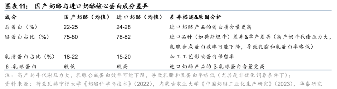 总结来看,我们认为两油一酪的生产技术难点本质是原料与工艺的精准匹配,而国产产品与进口产品的差异在于上游奶源的标准化管理水平和生产设备的精度控制能力。近年来,国产头部企业通过引进进口设备、建设标准化牧场等逐步缩小与进口厂商之间的差距,但奶源波动和设备精度不足仍是制约产品品质的关键。此外,在压降成本方面,国产奶酪的头部企业通过原材料端的国产替代(如使用本土奶源降低生产成本)和销售挤压熟成后产生的乳清相关副产品(如提取乳清蛋白用于运动营养品)、贡献收入增量。据中国乳制品工业协会《中国乳清产业发展现状分析》(2023年),我国乳清产品60%以上依赖进口(美国、欧盟等),自主生产因成本和技术受限,难以突破高端市场(如水解乳清蛋白)。