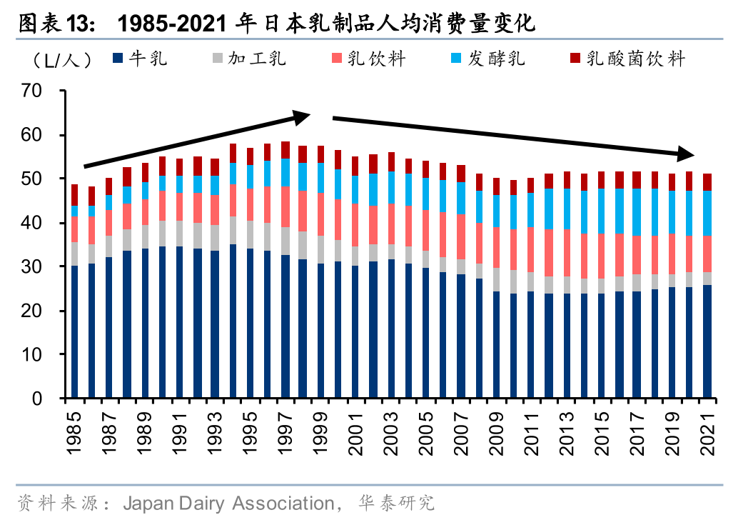 日本乳制品人均消费量于2000年前后见顶,消费结构性升级趋势明显,酸奶、奶酪等高附加值产品占比提升。从人均消费量来看,日本的乳制品整体人均消费量于2000年前后见顶,乳制品行业逐渐步入发展成熟期,但消费结构性升级趋势明显,牛乳/加工乳/乳饮料的消费量在2000年后呈现波动下滑态势(人均消费量由2000年的30.9/5.1/9.4L下滑至2021年的25.5/3.0/8.4L),而在此期间,附加值更高的发酵乳人均消费量明显增加(由2000年的6.5L提升至2021年的10.1L),黄油/奶酪等产品亦接力液奶、步入发展快车道。动因来看,乳企差异化竞争、消费者健康化消费趋势导致日本乳制品向高营养价值、多元风味、保健型/功能性的方向升级。