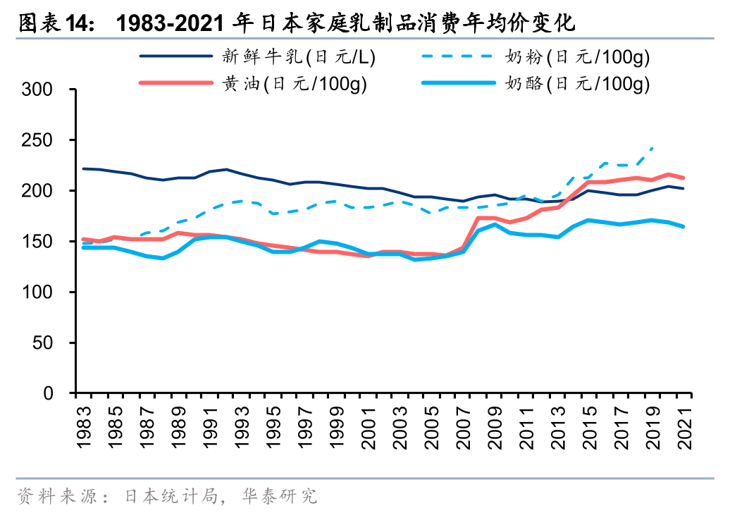 2)奶酪/黄油:日本乳制品消费存在西式化趋势,奶酪、黄油品类消费量快速增长。2000-2021年期间,黄油/奶酪在日本奶类消费支出中的占比分别由2.0%/9.0%提升至3.6%/17.6%。究其原因,主要包括相关企业不遗余力的市场教育(1973年11家日本本地奶酪生产商联合组建了“日本奶酪促进委员会”,1994年日本发起“农村奶酪普及”事业,让奶酪走出城市并深入农村)、家庭西式餐桌的兴起以及零食奶酪的快速放量等。高附加值的奶酪、黄油品类消费量快速增长,进一步助力乳制品行业向多元化趋势发展。