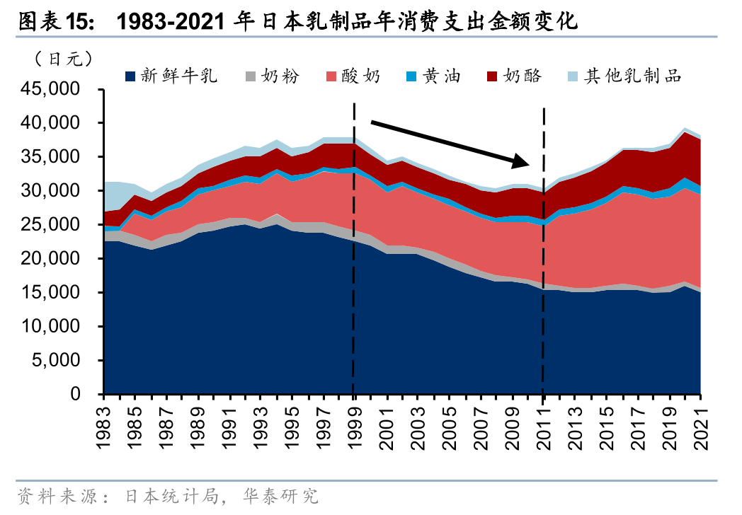 1)酸奶/发酵乳:液奶支出占比下滑,酸奶消费占比明显提升。随着加工乳及牛乳的人均消费量分别于1997年和2003年见顶,易吸收、助消化的酸奶消费步入快速上升通道。日本乳企瞄准酸奶、发酵乳品类从供给端进行创新以实现产品差异化竞争,叠加消费者对乳制品的需求向健康化、保健型/功能性、更高营养价值的方向升级,明治、养乐多、雪印、森永等乳企顺应市场需求提供高附加值产品、形成相对稳定的竞争格局。2000-2021年期间,新鲜牛乳在日本奶类消费支出中的占比由60.5%下降至39.1%,酸奶在日本奶类消费支出中的占比由22.4%提升至36.1%(据日本统计局)。