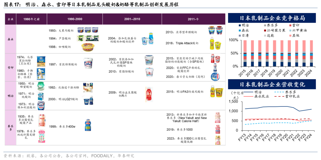 明治:提案式销售深化B端布局,研发实力塑造竞争优势。明治作为日本乳制品龙头(据欧睿,24年市占率14.6%),通过全生命周期产品布局与高附加值产品转型实现稳健增长,其核心竞争力体现在:1)研发实力突出:明治通过自建研究机构与外部学术部门合作,持续深化乳酸菌功能研究;2)定制化服务深度绑定下游B端客户:通过“提案式销售”为7-11、罗森等下游客户提供定制化服务;3)全产业链协同:应用中心联动客户需求,乳清蛋白/奶基底等高附加值原料的收入占比提升,提振公司盈利能力。