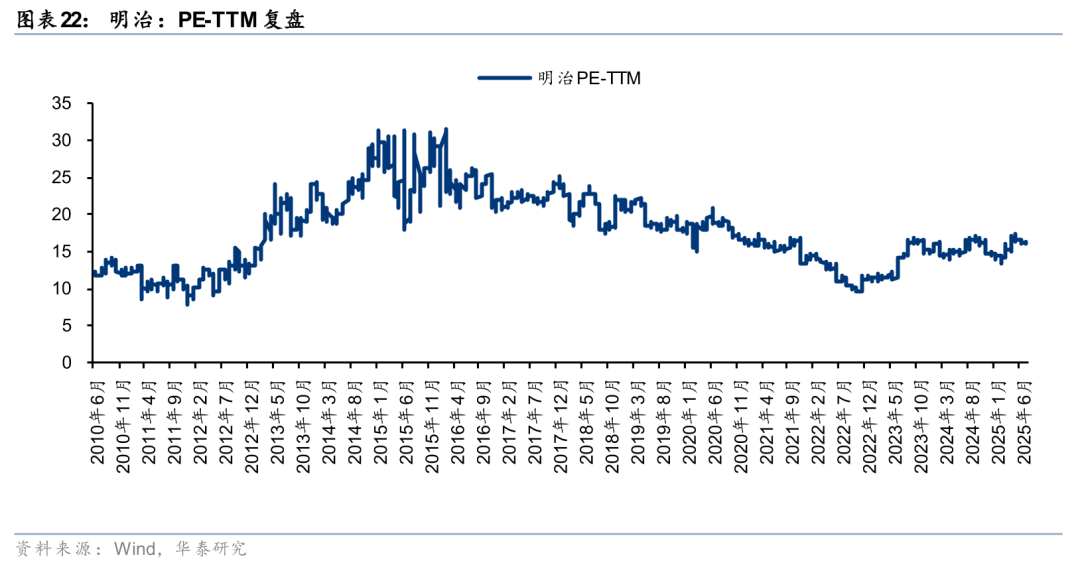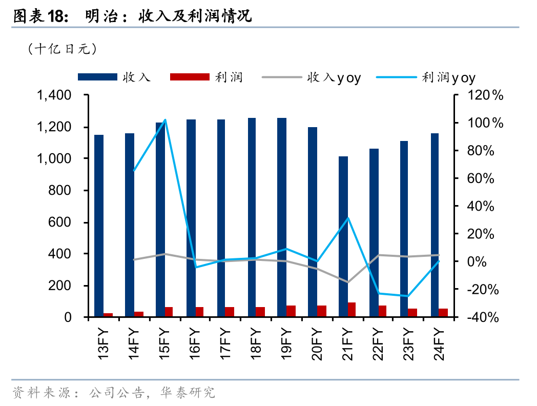 股价复盘:1)2013年之前(PE-TTM均值为12.0x):此阶段公司以婴幼儿奶粉为主营业务,日本国内新生人口数量陷入瓶颈,公司乳制品业务营业利润率长期低于5%,且产品同质化问题突出,缺乏高附加值品类。2)13-16年(PE-TTM均值为23.4x):此阶段公司战略转向中老年营养品,推出针对心脑血管、骨骼健康的配方奶粉,高附加值产品的收入占比提升,2016年公司在老年保健食品的市占率达31.4%、位列行业第一;同时食品业务中功能性酸奶(明治Probio Yogurt R-1、LG21等)以及巧克力等核心品类借力健康化趋势实现热销,制药业务依靠仿制药与创新药授权实现增长,共同驱动公司盈利能力提振。3)17-22年(PE-TTM均值为18.5x):此阶段日本国内消费市场趋于饱和,人口老龄化加剧,日本通胀低迷与人口结构问题的共同制约下、消费者对于食品的需求增长乏力,17-22财年公司收入CAGR为-3.1%,增长乏力带动公司PE-TTM估值在17-22年由22.3x下行至11.9x。4)2023年至今(PE-TTM均值为15.1x):此阶段日本再通胀预期提升了消费板块的整体股价吸引力,公司致力于食品业务多元化布局、以平滑周期波动;此外,公司因高分红及现金流稳健(自由现金流100%分红)获得估值支撑。