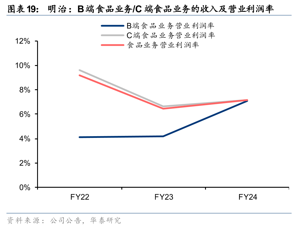 2B业务发展势头较好,持续优化产品结构,强化高附加值功能产品的产业协同优势。近年来,明治的B端业务拓展逐步聚焦于高附加值乳制品原料及功能食品的深度供应,已从传统的“代工 原料”模式转向更具技术含量和品牌赋能价值的“功能型 解决方案”输出路径,聚焦酸奶原料、蛋白乳清、奶基底等高附加值品类。具体来看,公司设立“明治应用中心”,作为客户共创平台,通过面对面交流了解其技术与功能需求,提升产品匹配度;引入更多具有创新意识的研发及市场人才,以加快2B产品开发的反应速度。公司在酸奶、营养奶粉、乳蛋白等品类中,已具备稳定且结构化的B端客户配方输出能力,与日本本土的大型便利店、连锁餐饮品牌及海外食品工业客户建立长期稳定的合作关系。