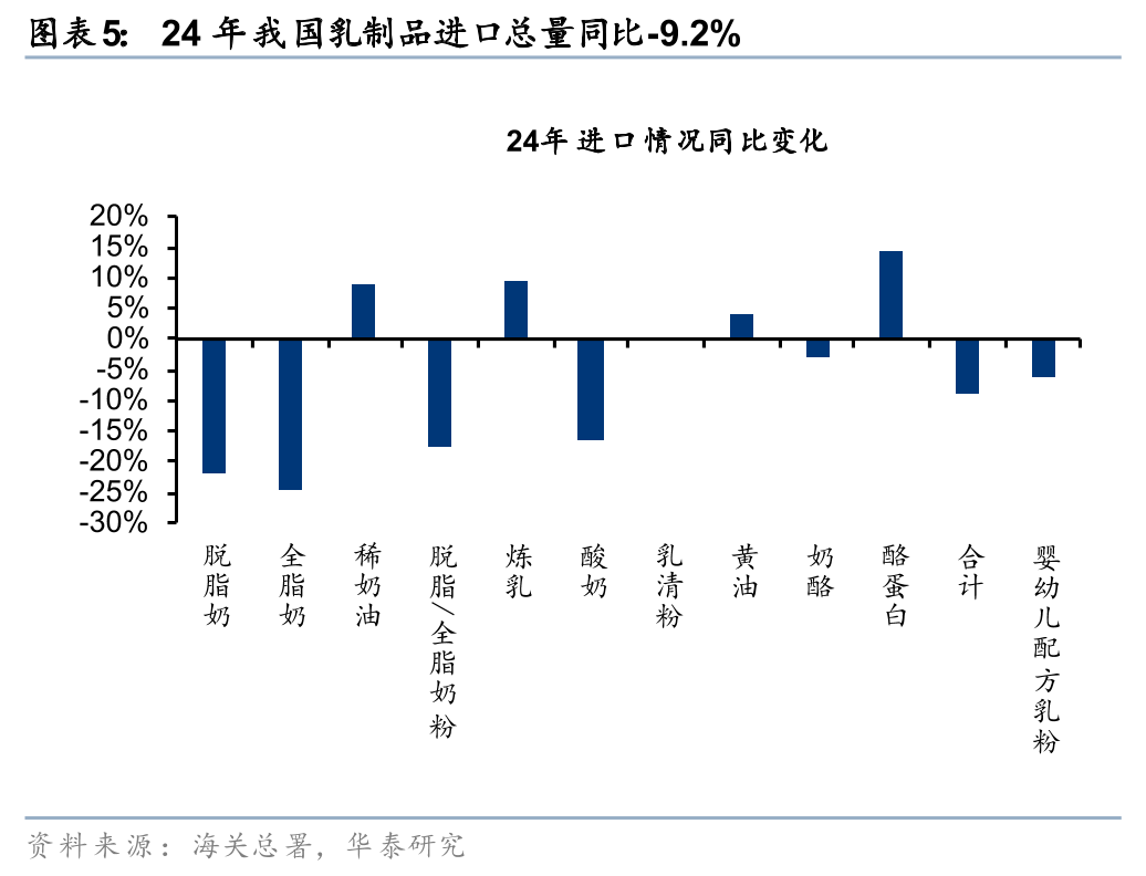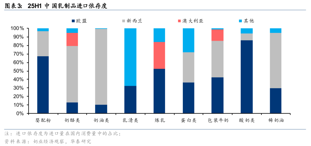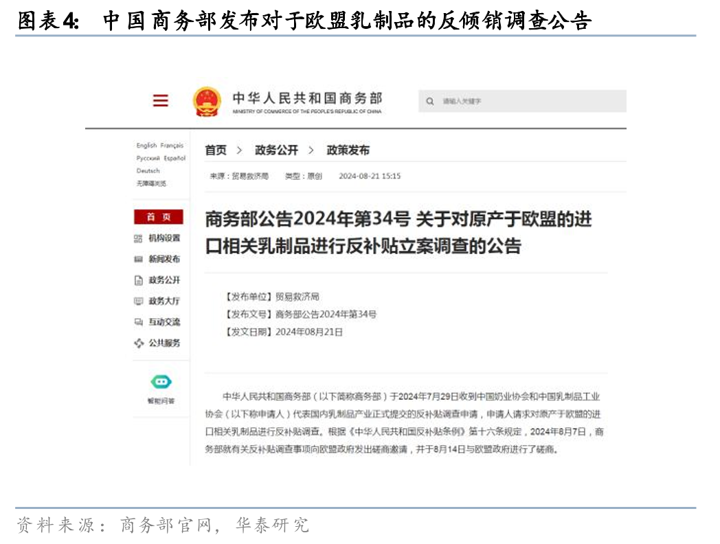 1)反倾销调查:中国商务部发布对于欧盟乳制品的反倾销调查公告,致力于保障国内乳品行业的正当权益。基于此前中国奶业协会和中国乳制品工业协会代表国内乳制品产业提交的反补贴调查申请,认为原产于欧盟的进口乳制品接受了欧盟及其成员国政府的补贴,对中国乳制品产业造成严重冲击和损害,24年8月21日中国商务部发布“关于对原产于欧盟的进口相关乳制品进行反补贴立案调查”的公告,决定对原产于欧盟的进口相关乳制品进行反补贴立案调查,涉及的产品包括鲜乳酪、经加工的乳酪、蓝纹乳酪等,主要对象国包括法国、丹麦、意大利、西班牙、爱尔兰、荷兰等国。据奶业经济观察,25H1我国奶油类/稀奶油/奶酪的进口总量中,欧盟分别占比10%/30%/13%。