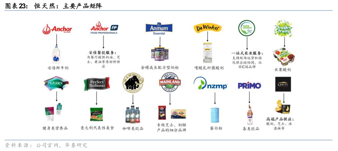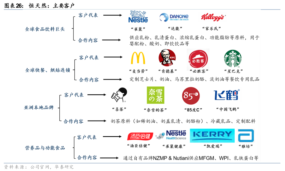 恒天然:由大宗原料商到价值链整合者,新西兰奶源优质、产品品质突出、以客户共创模式开发场景化解决方案。恒天然是全球领先的乳制品出口商,已成为绝大部分全球TOP 50食品企业的核心乳制品原料供应商。恒天然依托新西兰的优质奶源(乳脂含量4.5%-5.2%/高于全球行业均值3.8%-4.3%、蛋白含量3.5%-3.8%/高于全球行业均值3.0%-3.3%)和全产业链协同,构建了“原料供应-功能创新-场景解决方案”的完整价值链。目前公司已升级为高附加值服务商,通过NZMP模块化原料、功能性配方及本地化研发,深度绑定全球头部客户。大中华区作为恒天然的战略重心(24年收入占比27.7%),其成功源于产品质量优异、渠道改革与客户共创模式,实现从“产品输出”到“价值输出”的战略跃迁。