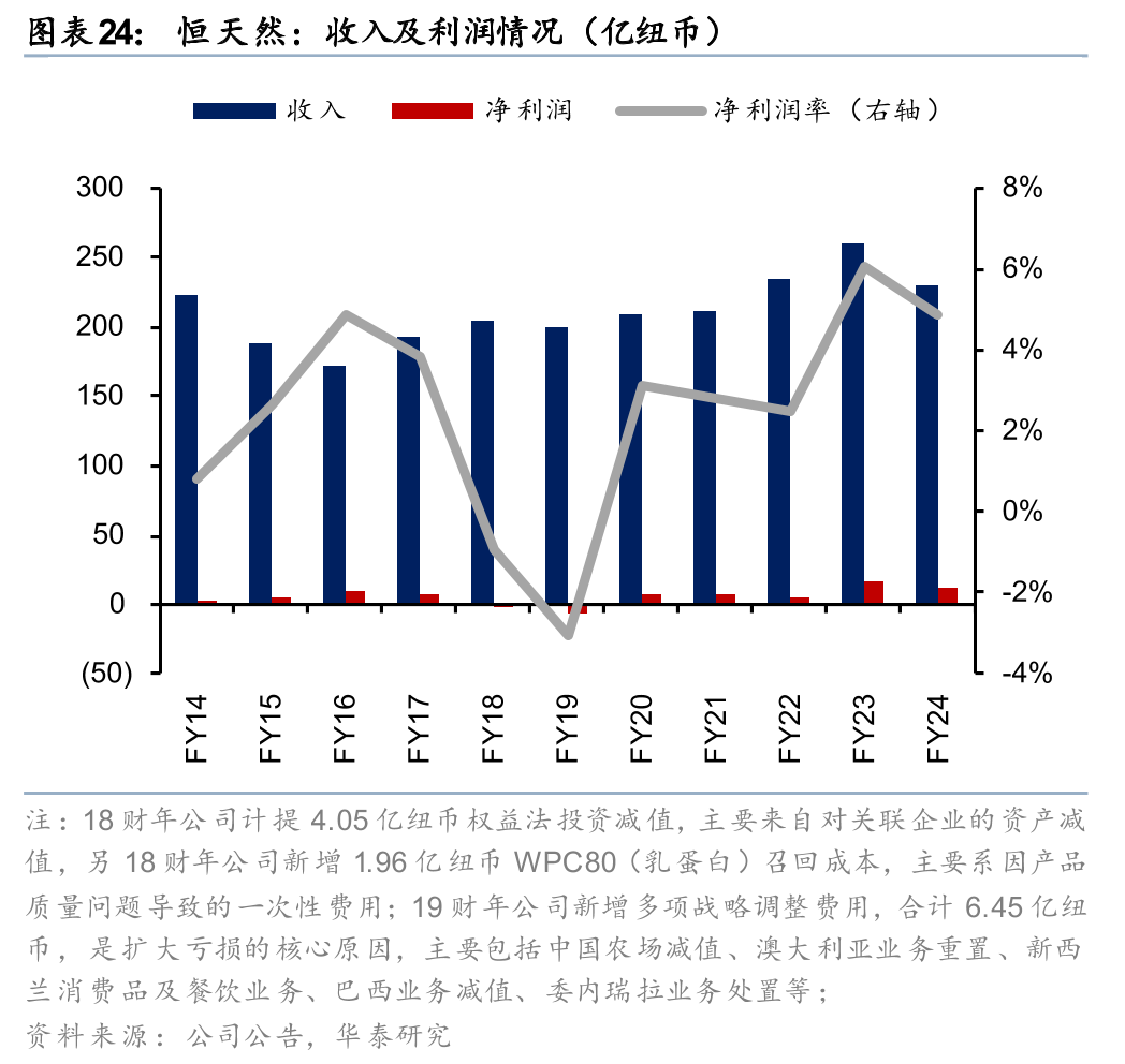 恒天然(Fonterra)是全球领先的乳制品出口商,总部位于新西兰,采用合作社模式运营,拥有众多奶农股东。公司以天然草饲奶源和完善的全球供应链为基础,产品覆盖乳粉、乳清蛋白、奶酪、乳脂、功能性蛋白等多类原料与高附加值营养产品,已成为绝大部分全球TOP 50食品企业的核心乳制品原料供应商。1920s以来,新西兰各地出现区域性乳业合作社,1960s新西兰政府推动合作社合并,形成新西兰乳品局(NZDB)和新西兰合作乳品公司(NZCDC)。1980s新西兰取消农业补贴,倒逼乳企效率提升,恒天然前身企业(Kiwi)开始投资喷雾干燥技术,大规模生产全脂奶粉。2001年新西兰政府主导三大合作社(NZDG、Kiwi、NZDB)合并,正式成立恒天然合作集团,成为全球最大的乳制品出口商。恒天然通过NZMP和安佳等品牌服务全球食品制造、餐饮、营养健康等企业客户,渠道优势与客户粘性较强,正从传统原料出口商转型为“全球营养解决方案供应商”。24财年公司总营收229.9亿纽币(合992.1亿人民币),13-24财年的收入CAGR为1.9%,净利润11.3亿纽币(合48.7亿人民币),13-24财年的利润CAGR为18.2%。