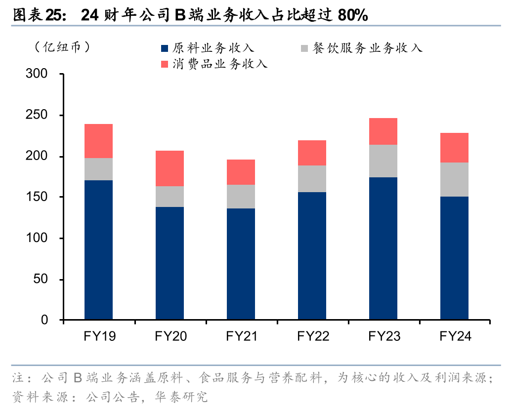1)B端业务中,恒天然以大宗乳品原料为基础,供应包括全脂奶粉、脱脂奶粉和无水乳脂等标准化产品,主要服务于食品制造商和再加工企业。24财年恒天然的原料业务实现收入150.9亿纽币(合651.3亿人民币),收入占比65.6%,是恒天然的核心收入来源。恒天然已覆盖全球140多个国家的食品生产商和分销商,负责全球乳制品原料的生产与出口。同时恒天然针对B端餐饮渠道开发了定制化的解决方案,为商业厨房提供乳制品解决方案,以定制服务为主,如专门为连锁餐饮和茶饮品牌设计奶酪、奶盖和烘焙奶油等产品,与星巴克、喜茶等头部客户形成稳定的供应关系。在专业营养领域,恒天然聚焦高附加值原料的研发与生产,包括婴幼儿配方奶粉基粉、运动营养乳蛋白以及模拟母乳成分HMO等特殊配料,这些产品凭借技术壁垒在医疗营养和功能性食品市场占据重要地位。24财年恒天然的餐饮服务业务实现收入40.6亿纽币(合175.1亿人民币),收入占比18.6%。