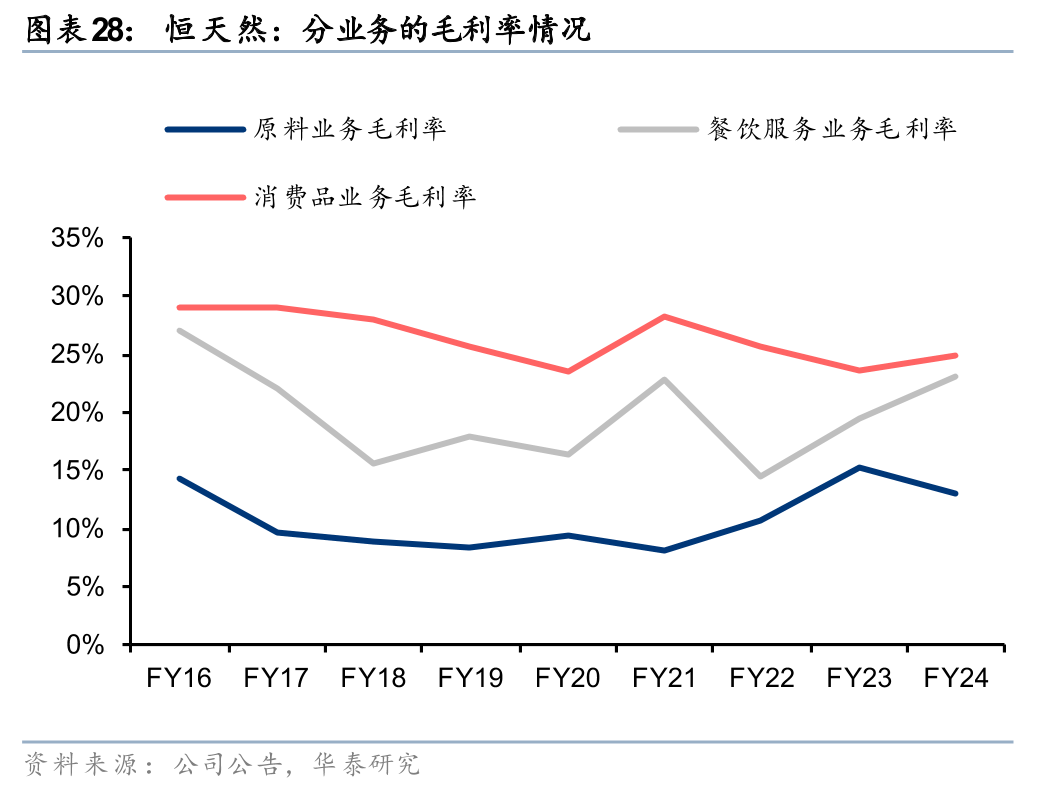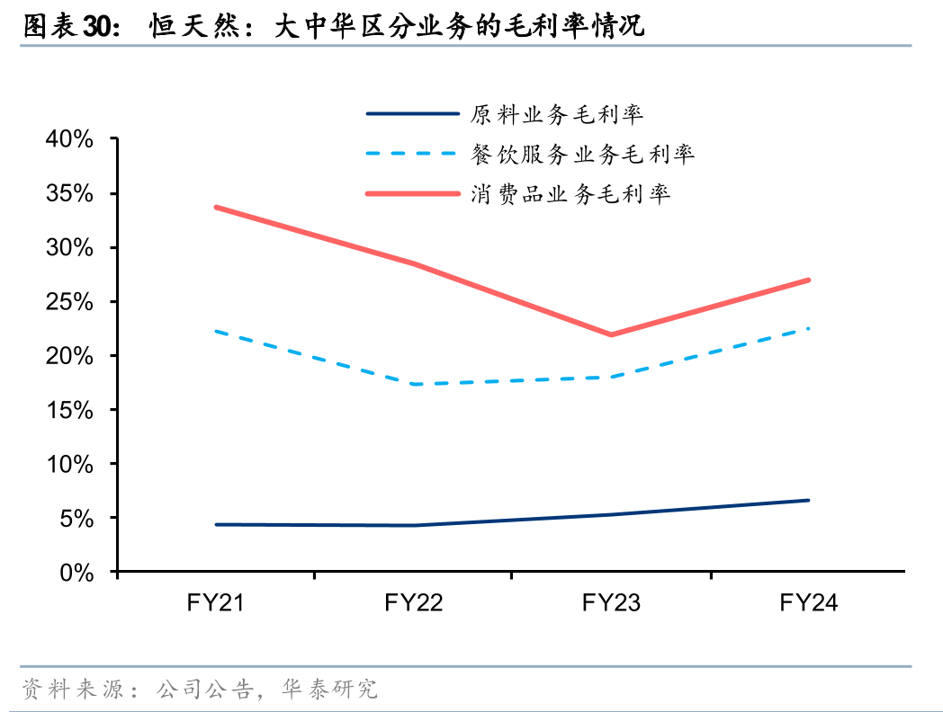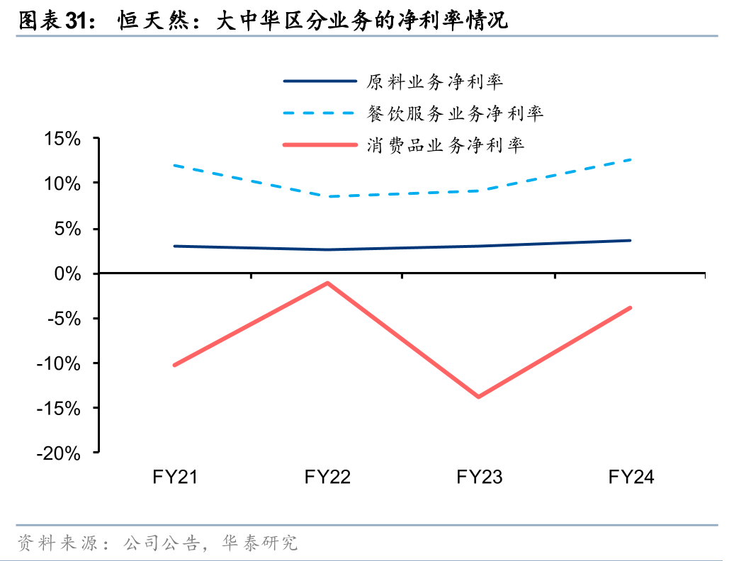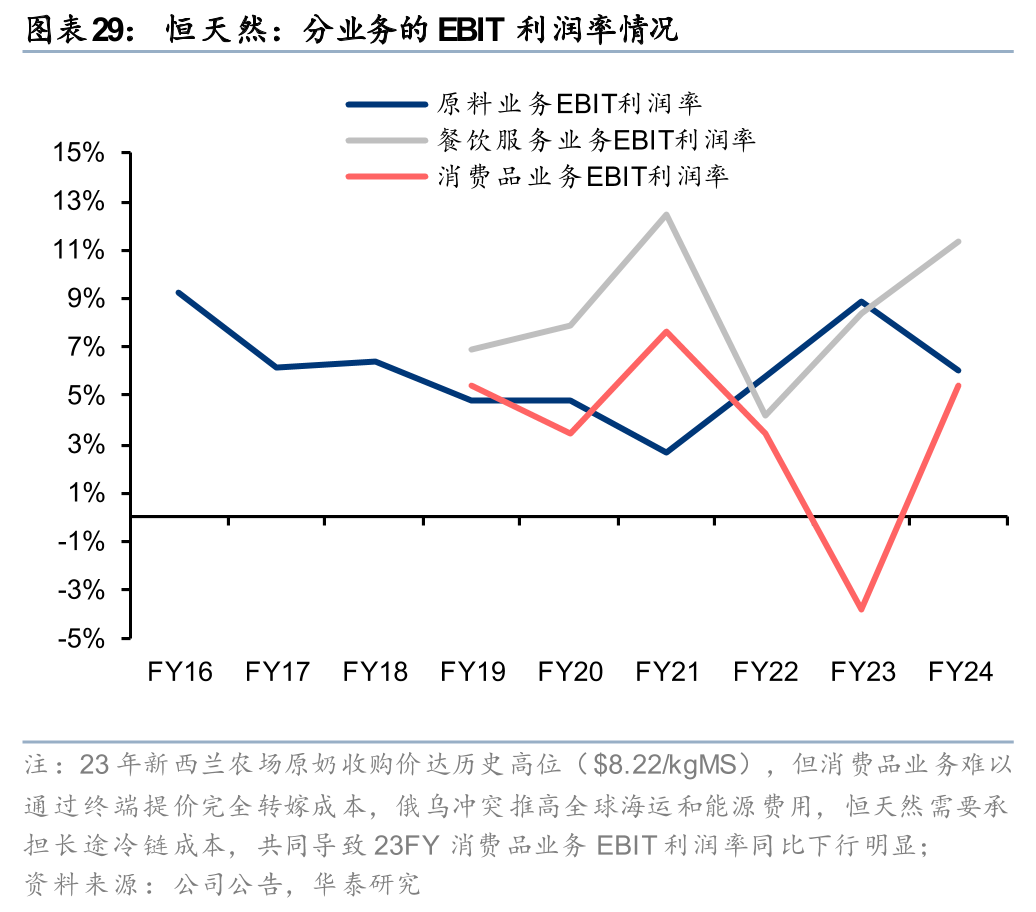 从大中华区(中国及东南亚市场)的财务数据来看,24财年大中华区毛利率为13.8%,净利率为6.5%,各业务条线的盈利能力有所分化。原料业务的毛利率从21财年的4.3%提升至24财年的6.6%,净利率从3.0%上升至3.6%,主要系恒天然通过成本优化及定价策略调整等措施,毛利率和净利率均实现稳步增长。餐饮服务业务是恒天然大中华区的核心盈利板块,21-24财年的毛利率均值为19.9%、净利率均值为10.6%,较强的盈利能力表明恒天然在价值链中具备较强的定价权,较好的产品品质与定制化服务使得恒天然具备一定的品牌溢价能力。消费品业务的毛利率高于原料业务与餐饮服务业务,但费用率高企使得C端业务的净利率在21-24财年始终为负(24财年为-3.8%)。
