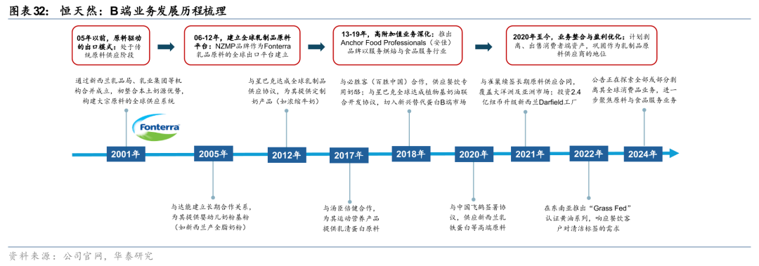 恒天然B端业务的发展历程呈现清晰的战略升级路径,从早期依托新西兰奶源优势的大宗原料出口,逐步转向以技术和服务驱动的定制化营养解决方案。2005年以前,恒天然的业务以大宗乳制品(全脂奶粉、乳清蛋白等)的出口为核心,通过NZMP品牌建立全球原料供应链,服务食品加工企业;2010年后,随着消费升级趋势显现,公司战略重心转向高附加值场景,2015年推出Anchor Food Professionals(安佳)品牌,切入烘焙、茶饮等餐饮细分赛道,提供淡奶油、芝士片等定制化半成品。2019年至今,恒天然的业务开展进一步向“营养 服务”的方向深化,通过NZMP功能原料模块(如乳蛋白、益生菌)和Nutiani高端健康解决方案,绑定国际食品巨头及特医食品客户,实现从“供应商”到“技术合作伙伴”的转型。2024年5月16日恒天然公告计划剥离全球消费品业务(涉及Anchor、Anlene等品牌),回归“原料 餐饮服务”主业,强化B端核心优势、实现战略聚焦。