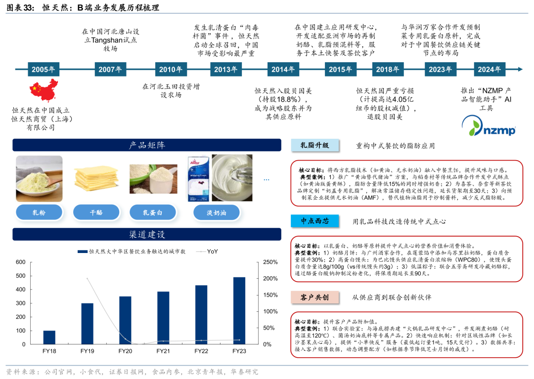 分区域看,大中华区24财年在公司总收入中占比27.7%,需求增长较快,已成为公司区域收入增量的重要引擎,我们以中国市场为例,安佳专业乳品作为恒天然在中国市场的餐饮品牌,深耕B端乳制品深加工市场多年,产品覆盖淡奶油、黄油、奶酪等,本地化深耕成效显著。恒天然进入中国的历史最早可以追溯至1973年,其早期经营模式为粗放的经销商分销模式,通过经销商铺货,响应速度较慢、稳定性较差。1)渠道端:2015年朱晓静被任命为大中华区的总裁,开启了餐饮业务的渠道通路改革,在北京、上海和深圳等地建立冷链中心以及客服体系,在全国范围内拓展经销商网络,2018年开始布局下沉市场,渠道变革之下、产品到货时间显著缩短,客户粘性增强。2)产品端:恒天然入华超50年持续推进本地化深耕。2015年恒天然在中国建立应用研发中心,开发适配亚洲市场的再制奶酪、乳脂预混料等,服务于本土快餐及茶饮客户;2023年恒天然与华润万家合作开发预制菜专用乳蛋白原料,完成对于中国餐饮供应链关键节点的布局。3)研发端:恒天然通过“乳脂升级”与“中点西芯”形成技术联动,典型案例包括无水奶油替代植脂奶油、黄油改良月饼皮、奶酪升级馅料等,“客户共创”战略反向推动恒天然的研发迭代,如与海底捞共建“火锅乳品研发中心”,火锅奶酪需求催生恒天然的耐高温蛋白专利等。