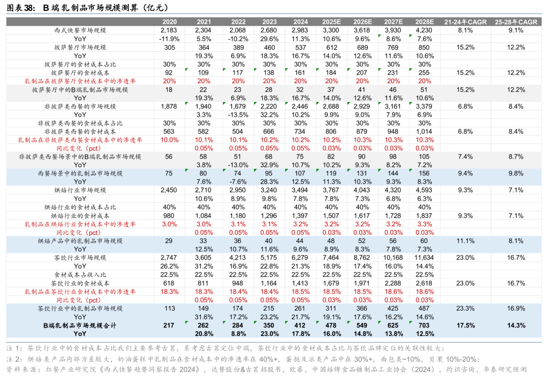规模测算:我们用西式快餐行业(含披萨餐厅和非披萨类西式快餐)、烘焙行业、茶饮行业的下游市场规模,综合考虑食材成本的占比和乳制品在食材成本中的渗透率,除了乳制品在披萨餐厅食材成本中的渗透率我们假设不变以外,其余场景的乳制品渗透率我们预计逐年小幅提升,最终算得2024年B端乳制品市场规模为412亿元,对应21-24年CAGR为17.5%,其中西餐场景/烘焙场景/茶饮场景的市场规模分别为107/44/261亿元,对应21-24年CAGR分别为9.4%/11.1%/23.3%,预计2028年B端乳制品市场规模有望达703亿元,对应25-28年CAGR为14.3%,其中西餐场景/烘焙场景/茶饮场景的市场规模分别为156/60/487亿元,对应25-28年CAGR分别为9.8%/8.1%/16.9%(由于我们仅考虑西餐、烘焙、茶饮这三种主要的应用场景,预计我们的测算结果会小于总的行业规模)。